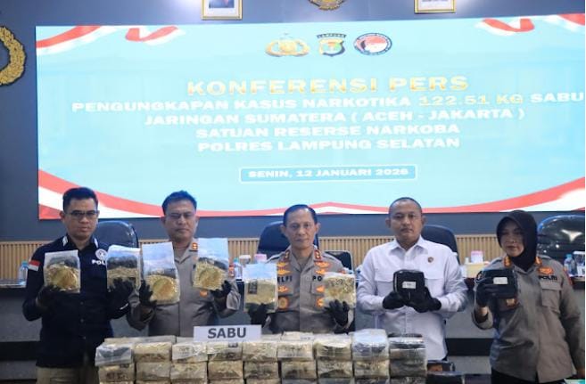 Lampung (Medinas_News) — Upaya penyelundupan narkotika dalam jumlah fantastis kembali digagalkan aparat kepolisian. Satuan Reserse Narkoba Polres Lampung Selatan berhasil membongkar pengiriman 122,51 kilogram sabu yang dikamuflase di balik muatan 8 ton jengkol di area Seaport Interdiction Pelabuhan Bakauheni, Lampung Selatan. Pengungkapan kasus ini terjadi pada Sabtu (27/12/2025) malam, sekitar pukul 21.00 WIB. Polisi menghentikan […]